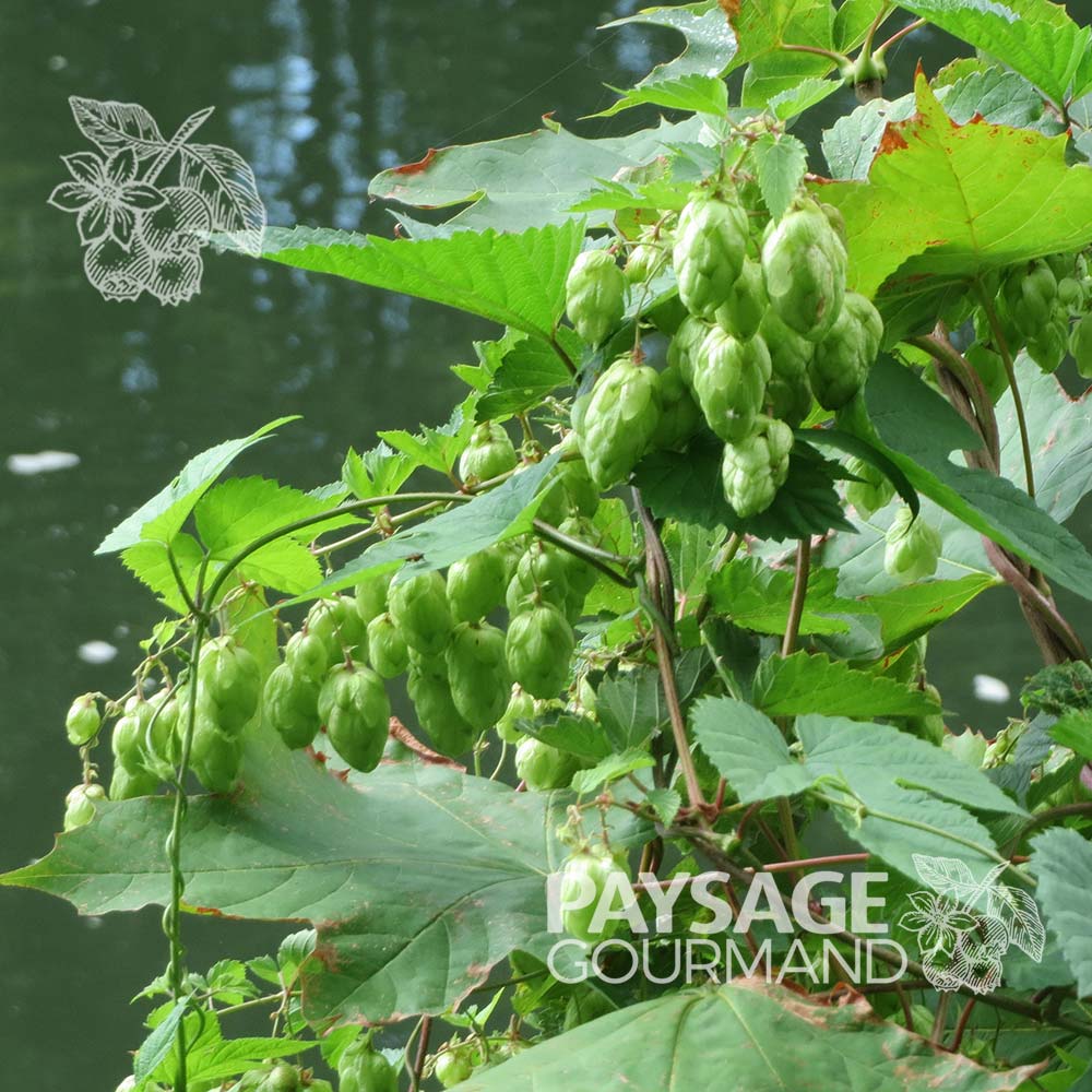 Vers la fin de l’été, quand un parfum happe vos narines au passage, c’est le temps de récolter les fleurs femelles résineuses aux écailles cachant une poussière d’or dont les tannins aident à la conservation des aliments, traditionnellement la bière et dont l’amertume fruitée citronnée et florale se marie aux douceurs pâtissières, qui s’enrichissent alors d’acides gras essentiels, rares dans le règne végétal. Les pousses qui pointent le long de rhizomes fuyants, représentent un beau problème pour les gourmands qui troquent la fourche pour la fourchette, puisqu’en vérité, la corvée prend une tournure heureuse quand l’envahisseur termine dans l’assiette, en micro-asperges cuites et tendres ou crues et croquantes, disponibles majoritairement au printemps. Leur effet somnifère, efficace en tisane amère à la fois digestive, favorise un sommeil profond sur un oreiller garni de houblon ‘Nugget’.