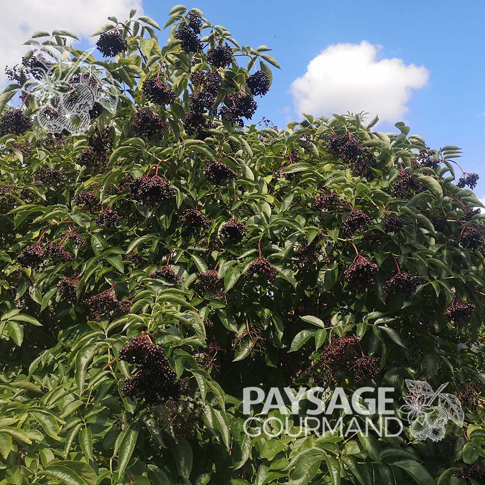 Il tend des bouquets fruités noirs violacés rappelant le bleuet, la mûre et le cassis. Toutefois, attendez qu’ils soient bien foncés, car les fruits immatures sont toxiques. Il est conseillé de les faire cuire pour éliminer assurément toute toxicité résiduelle à maturité, reconnue comme étant très faible si détectable. Seuls les oiseaux semblent l’apprécier frais. Comme de minuscules raisins secs, la déshydratation concentre les sucre des petites baies, peu sucrées de nature, mais faciles à sécher, comme les fleurs d’ailleurs. Ajoutez couleur et vitamines C à vos mélanges à pains, gâteaux, muffins, ou à vos céréales du matin, dont le lait prendra une teinte mauve, attestant de sa riche teneur en pigments anthocyanes antioxydants, outrepassant presque abusivement tous les records, faisant pâlir les bleuets… Leur transformation en tartes et en confitures reste classique et l’excellent vin de pays qu’il produit ne déroute pas le sommelier, avec une robe et des notes qui jouent dans le registre des vins de raisin. Les ombelles mûrissent presque simultanément. Deux passages et quelques coups de ciseaux rapides suffisent à en remplir des sacs et des sacs.