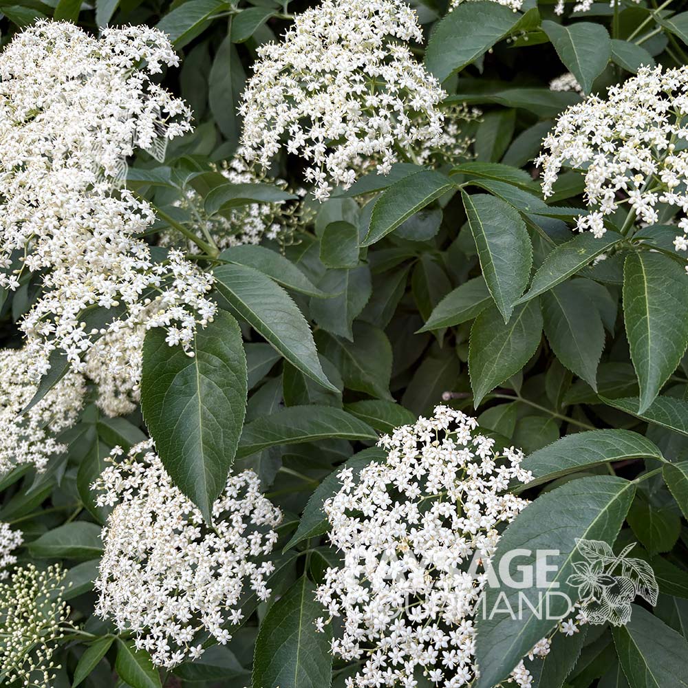 Avec sa croissance extrêmement rapide, le sureau du Canada ‘Ranch’ (Sambucus canadensis) peut vous aider dans votre recherche d’intimité. Ses fleurs, doucement parfumées, sont rafraîchissantes en boissons froides, stimulantes en infusion aidant à réduire la fièvre, et, avec leur structure en corymbe imbibée de pâte à frire font d’excellents en beignets.